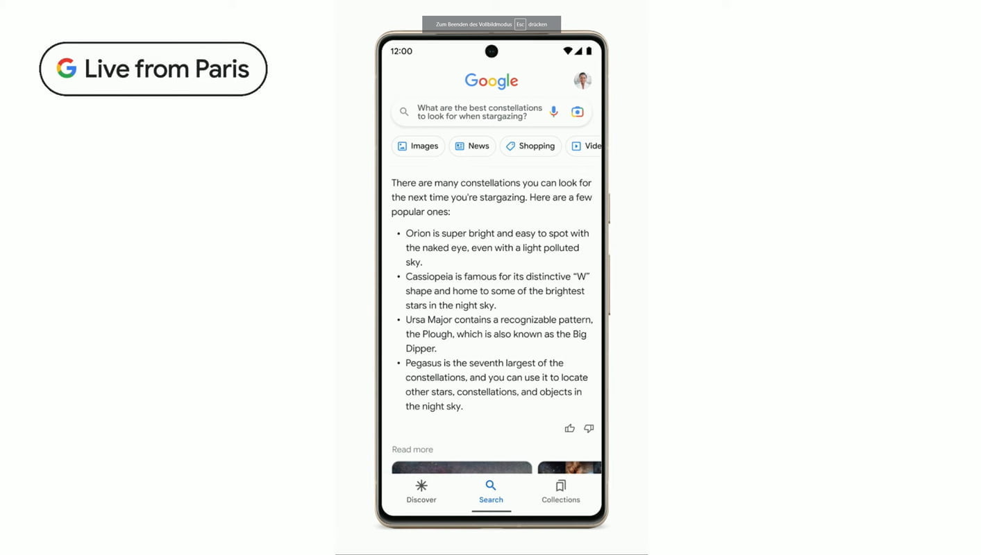 In der aus Paris übertragenen Präsentation hob Prabhakar Raghavan, Senior Vice President von Google und unter anderem verantwortlich für die Google-Suche, die zahlreichen Verbesserungen hervor, die das Unternehmen seit dem Start der Google-Suche vor fast 25 Jahren eingeführt hat. Fortschritte in der künstlichen Intelligenz ermöglichten ein besseres Sprachverständnis und eine multimodale Suche, z. B. mit Google Lens, sowie die automatische Übersetzung in mehr als 100 Sprachen mit Translate.