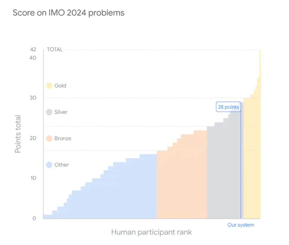 Die Systeme AlphaProof und AlphaGeometry 2 lösten vier der sechs gestellten Aufgaben und erreichten 28 von 42 möglichen Punkten. Das sei ein Schritt in Richtung künstliche allgemeine Intelligenz (AGI) mit fortgeschrittenen mathematischen Fähigkeiten, schreibt Deepmind. Eine Gold-Medaille gab es ab 29 Punkten, erreicht wurde sie von 58 der 609 Teilnehmenden.