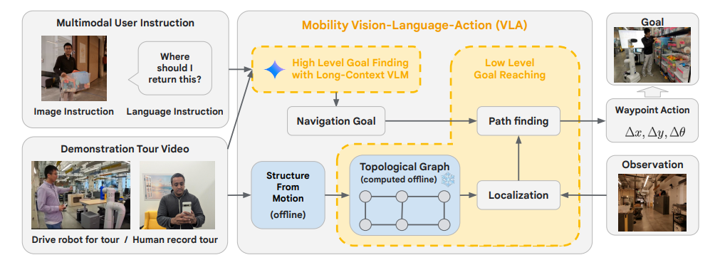Die Systemarchitektur verarbeitet die multimodalen Eingaben und erstellt daraus einen topologischen Graphen - eine vereinfachte Darstellung des Raums. Dieser Graph wird aus den Einzelbildern der Videotouren konstruiert und erfasst die allgemeine Konnektivität der Umgebung, so dass der Roboter seinen Weg auch ohne Karte finden kann.
