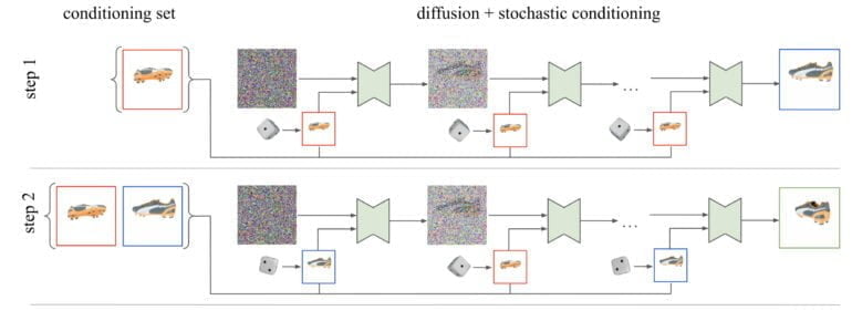 Googles 3DiM verarbeitet für die 3D-Ansicht ein einziges Referenzbild mit Informationen über die relative Pose und erzeugt per Diffusion eine neue Ansicht. Anders als vergleichbare KI-Systeme nutzt 3DiM diese neuen Bilder für die Generierung folgender Ansichten, statt für jede neu generierte Ansicht ausschließlich das Input-Bild zu setzen. Die Google-Forschenden bezeichnen das als eine stochastischen Konditionierung.
