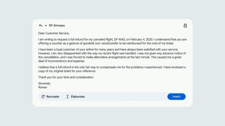 Google integriert im Rahmen der Workspace-Updates eine generative Text-KI in Gmail, die detaillierte Antwortvorschläge generieren kann. Google demonstriert dies am Beispiel einer Rückerstattungsanfrage an eine Fluggesellschaft mit einer elaborierten und detaillierten E-Mail, die die Chancen auf eine vollständige Rückerstattung erhöhen soll.