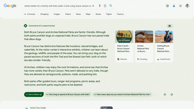 Wie bereits angekündigt, integriert Google KI-generierte Antworten direkt in die Google-Suche. Die experimentellen Antworten werden vor den traditionellen Google Suchergebnissen angezeigt. Die neue Suchoberfläche ermöglicht Folgefragen und Chatbot-Gespräche auf Basis von KI-Vorschlägen und integriert Links von Verlagen, Unternehmen und sozialen Medien.