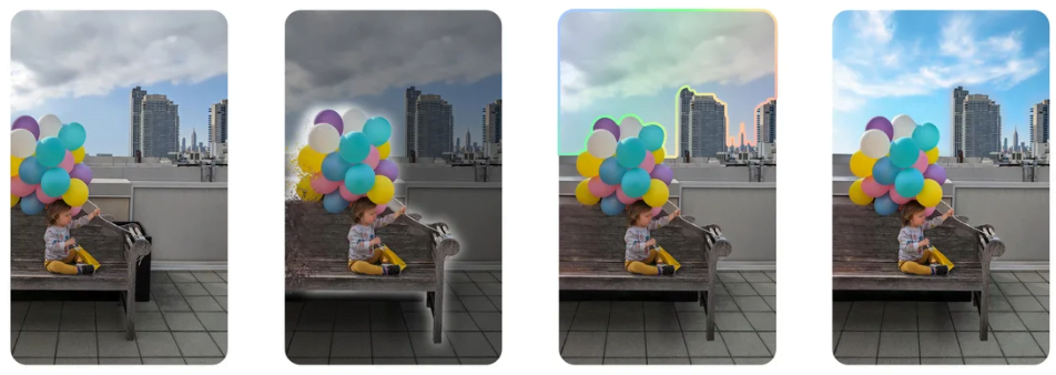 Der Magic Editor ist eine generative Bild-KI für eure eigenen Fotos. Er ermöglicht es, Elemente im Bild zu verschieben und fehlende Bildinformationen zu ergänzen. Google zeigt dies am Beispiel eines Fotos eines Kindes mit Luftballons in der Hand, die am Bildrand abgeschnitten sind. Zieht man das Kind in die Mitte, werden die Luftballons am Rand automatisch ergänzt.