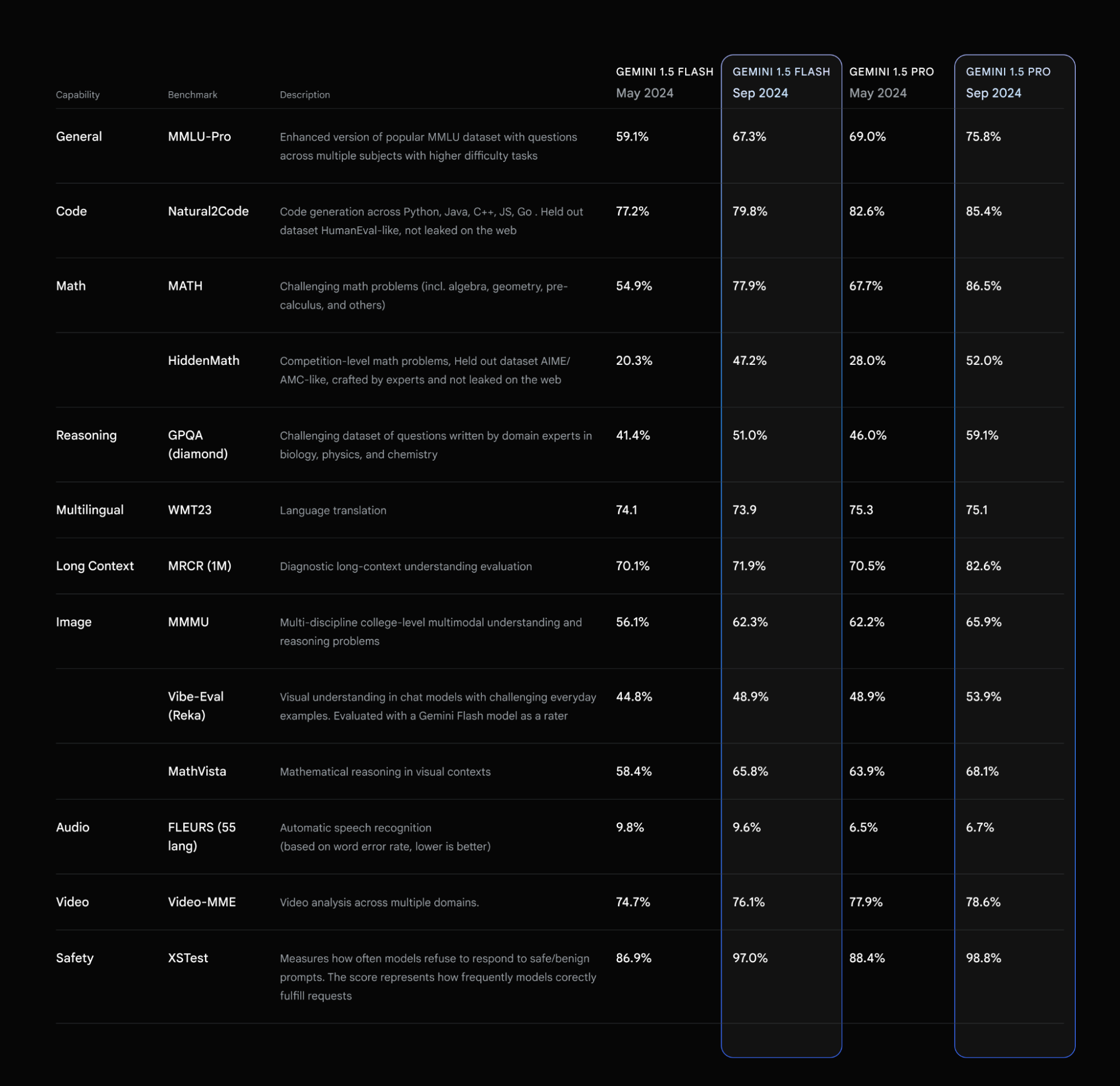 Die Preise für Gemini 1.5 Pro wurden für Input- und Output-Token um mehr als 50 Prozent gesenkt, die Ratenlimits für beide Modelle erhöht und die Latenz verringert. Laut Google haben sich die Modelle in verschiedenen Benchmarks verbessert, insbesondere in den Bereichen Mathematik, langer Kontext und Vision.