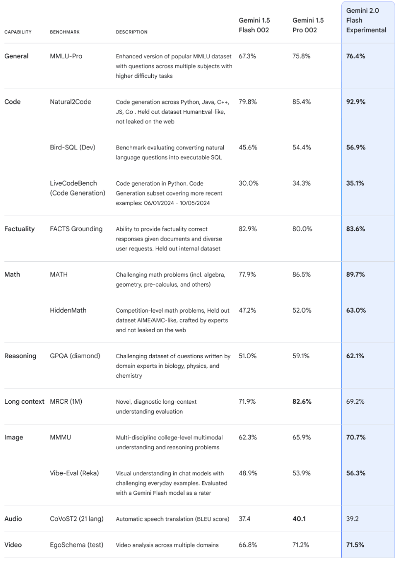 Im Vergleich zum Vorgängermodell Gemini 1.5 Pro ist das Flash 2.0 laut Google doppelt so schnell. In Benchmarks erreicht es fast die Leistung von Anthropics Sonnet "3.6", dürfte aber günstiger sein. Die Benchmark-Leistung kann jedoch von der Leistung in der Praxis abweichen.