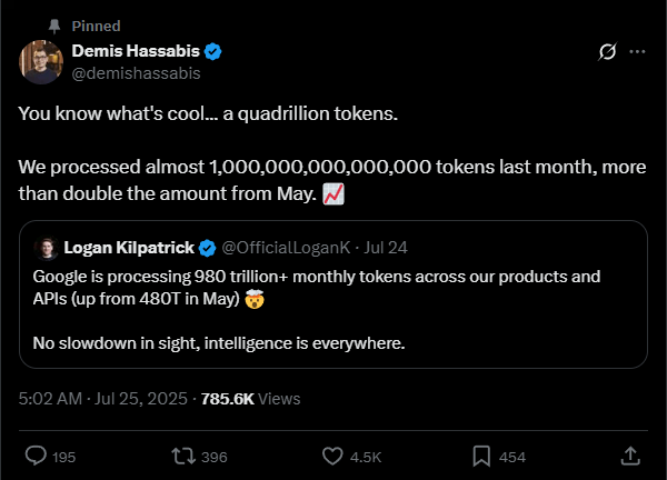 Google hat laut Produktmanager Logan Kilpatrick im Juni über 980 Billionen Token über seine KI-Produkte und APIs verarbeitet, mehr als doppelt so viele wie im Mai. Auch Deepmind-CEO Demis Hassabis meldet, dass die Systeme von Google im selben Monat fast eine Billiarde Token verarbeitet hätten. Token sind Textbausteine, die als Recheneinheit für KI-Modelle dienen.