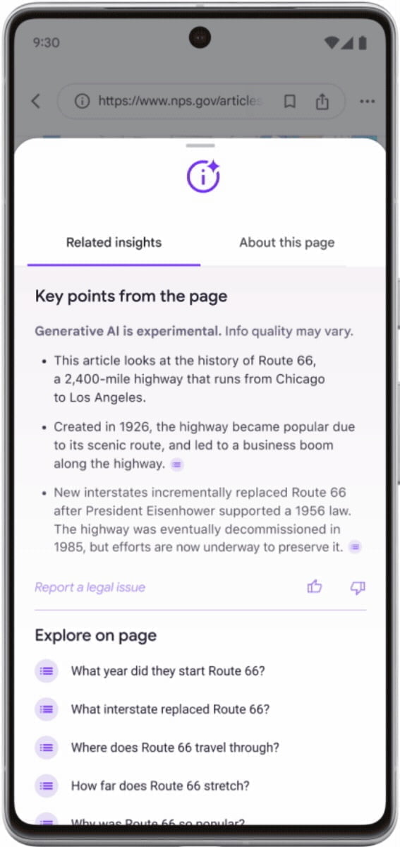 Auf manchen Webseiten, die du besuchst, kannst du durch Antippen eine KI-generierte Liste der wichtigsten Punkte anzeigen, die ein Artikel abdeckt, mit Links, die dich direkt zu dem führen, was du auf der Seite suchst. Wir helfen dir auch dabei, tiefer zu graben mit "Explore on page", wo du Fragen sehen kannst, die der Artikel beantwortet, und zu dem entsprechenden Abschnitt springen kannst, um mehr zu erfahren.