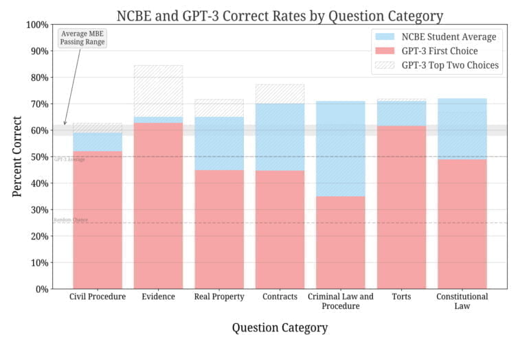 Für den Test nutzte das Team Vorbereitungsmaterial der National Conference of Bar Examiners (NCBE), der Organisation, die den Großteil der Bar Exams erstellt. GPT-3.5 konnte mit unterschiedlichen Prompts korrekte Antworten auf die Fragen geben, am erfolgreichsten war jedoch ein Prompt, der das Modell aufforderte, die Top-3 Antworten zu ordnen.