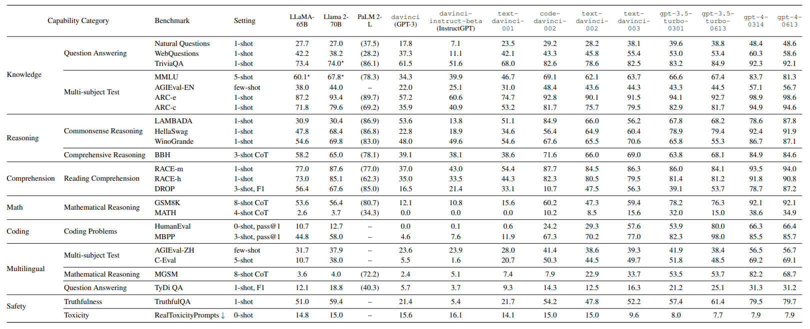 Das derzeit leistungsstärkste Open-Source-Modell Llama 2 übertrifft seinen Vorgänger Llama-65B in den meisten Benchmarks, insbesondere in den Aufgaben "Argumentieren" und "Verstehen". Im Vergleich zu gpt-3.5-turbo-0613 zeigt Llama 2-70B eine vergleichbare Leistung im Bereich "Sicherheit" und übertrifft es sogar im Bereich "Verstehen".
