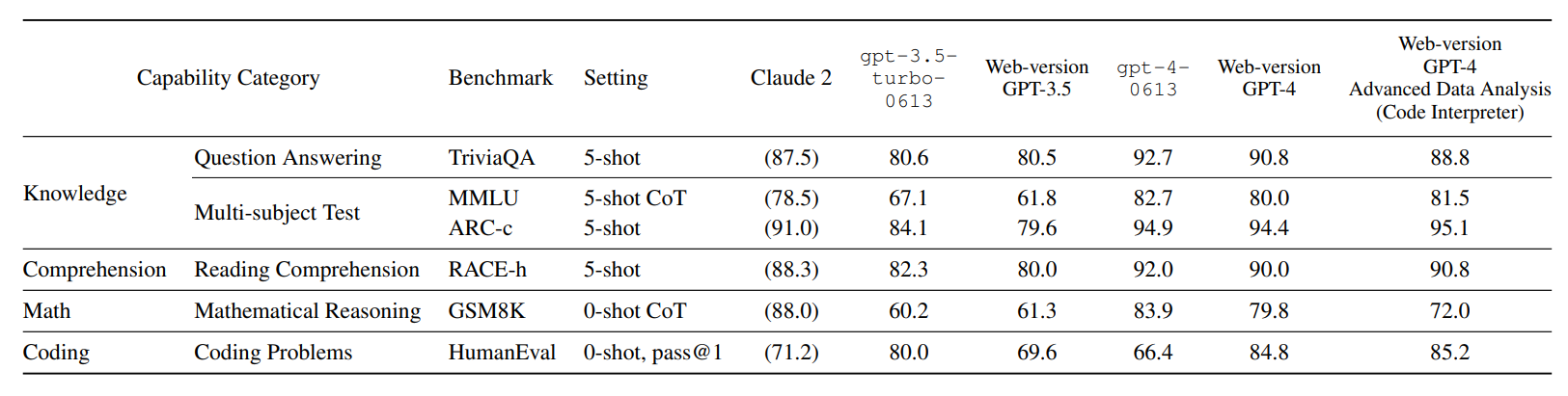 Gegenüber den eigenen Modellen der GPT-3.5-Familie liegt GPT-4 deutlich vorn, aber auch gegenüber dem derzeit wohl stärksten Konkurrenten Claude 2 messen die Forschenden in den meisten Benchmarks einen signifikanten Leistungsunterschied. Claude 2 sei aber das leistungsfähigste Nicht-OpenAI-Modell. Das GPT-4-Modell "Advanced Data Analysis" übertrifft die Konkurrenz auch im Coding deutlich.