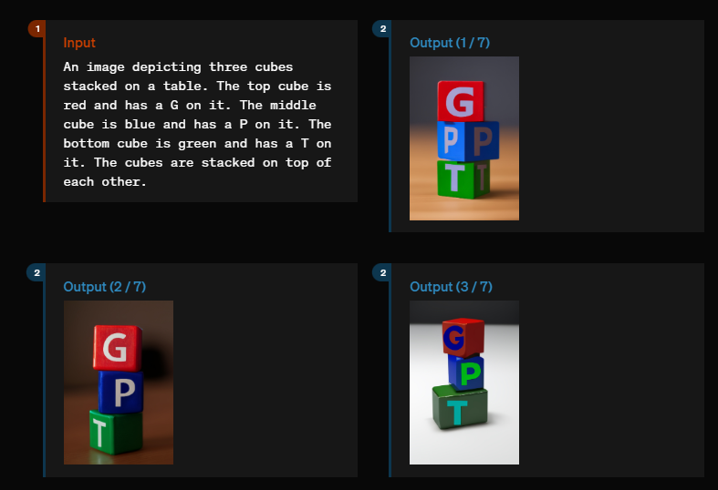 Schließlich zeigen die Demos, dass das Modell in der Lage ist, kausale Zusammenhänge in Bildern zu verstehen. In einem Beispiel werden drei Würfel mit den Buchstaben "G", "P" und "T" gestapelt. Dabei muss einerseits die Reihenfolge der Buchstaben (G, P, T) und andererseits die Reihenfolge der Farben (rot, blau, grün) eingehalten werden.