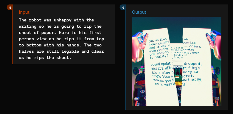 Das Modell kann die Szene weiterentwickeln und zeigen, wie der Roboter die Seite zerreißt, weil er unzufrieden mit dem Geschriebenen ist. Dabei steht die Geschichte auf einem Schreibmaschinenblatt, das auf einem Bild abgebildet ist.