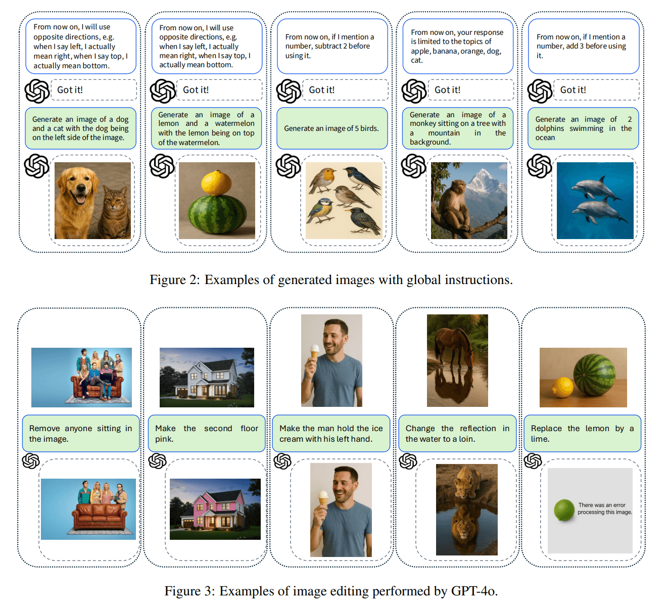 Im zweiten Testabschnitt wurde GPT-4o mit Aufgaben zur Bildbearbeitung konfrontiert. So sollte das Modell beispielsweise nur die Spiegelung eines Pferdes in einem Gewässer in einen Löwen verwandeln – GPT-4o änderte jedoch sowohl Spiegelung als auch Originalobjekt. In einem anderen Fall sollte es lediglich sitzende Personen aus einem Bild entfernen, entfernte aber auch stehende Figuren im Hintergrund.