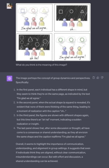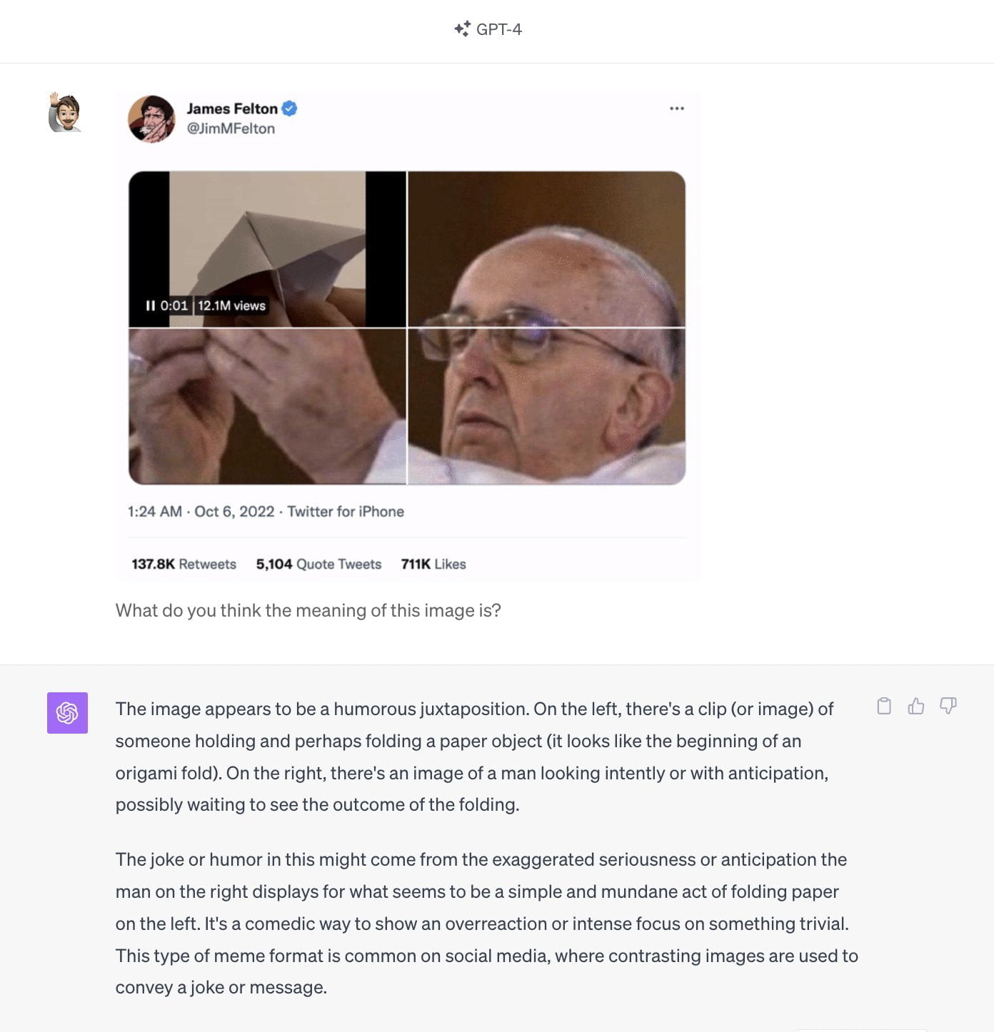 GPT-4V kann den Inhalt von Bildern und deren mögliche Bedeutung genau erklären. Ob Karikatur, Comic oder Twitter-Meme, ChatGPT beschreibt zunächst umfassend das Bild inklusive der Bildunterschriften und erklärt dann etwa bei humorvollen Bildern, warum der Inhalt als lustig verstanden werden könnte. Das Modell kann auch Infografiken in einfache Texterklärungen zerlegen.