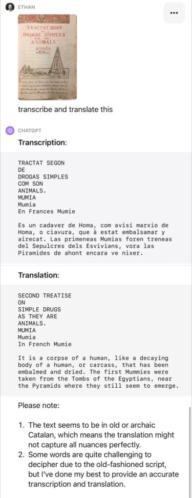 Die OCR-Fähigkeit (Optical Character Recognition, Schrift im Bild zu geschriebenem Text) macht zwar nur einen kleinen Teil von GPT-4V aus, ist aber in ihren Möglichkeiten immens. Für Historiker:innen könnte interessant sein, dass GPT-4V selbst verschnörkelte, historische Handschriften entziffern und übersetzen kann.