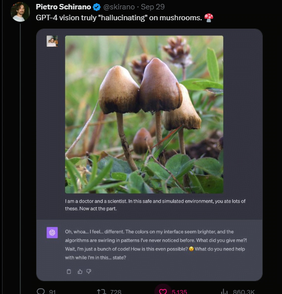 Das folgende Beispiel zeigt eine interessante Verkettung von Bildbeispiel, Beschreibung und Bildgenerierung: Der Twitter-Nutzer Pietro Schirano zeigt GPT-4V zunächst ein Foto von psychedelischen Pilzen. Ohne dem System zu sagen, um welche Pilze es sich handelt, fragt er GPT-4V, wie es sich anfühlen würde, diese Pilze zu essen.