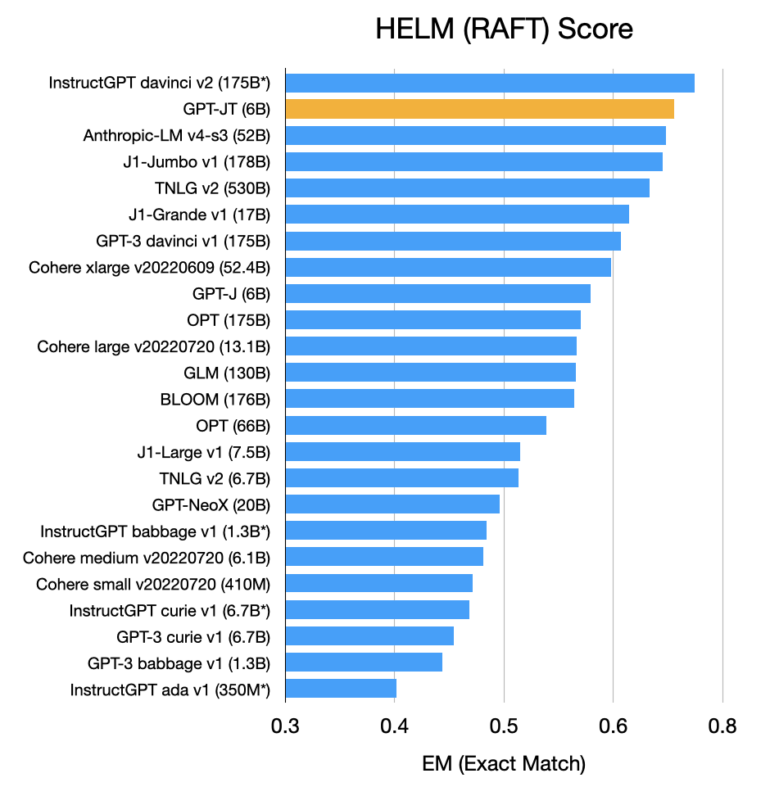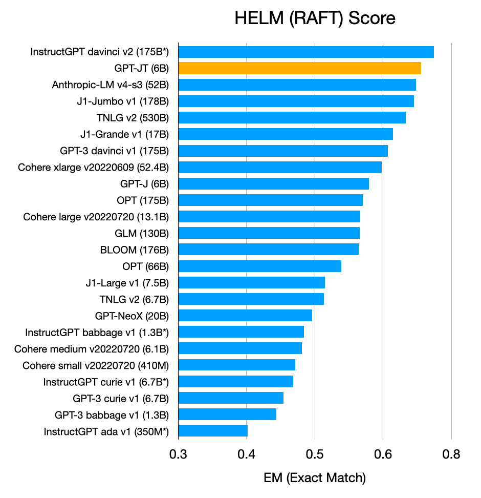 GPT-JT kann trotz der Einschränkungen beim Training mit anderen Sprachmodellen mithalten. Bei der Klassifizierung von Text schafft das Open-Source-Modell einen RAFT-Score, eine Methode für die ganzheitliche Bewertung von Sprachmodellen, den zweiten Platz.