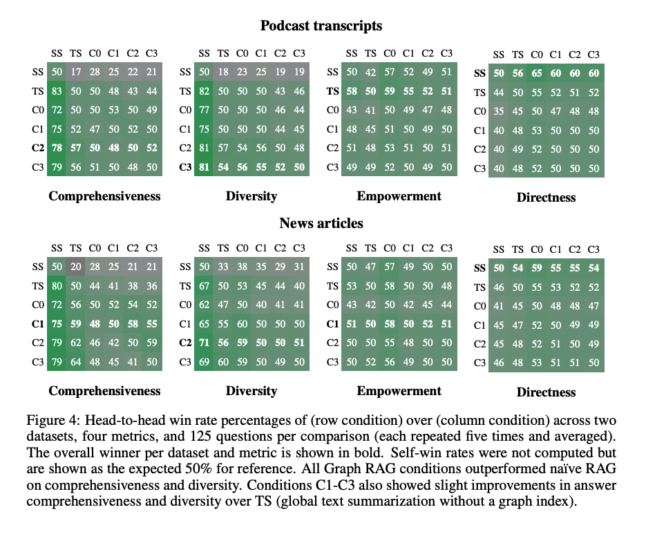 Die Forscher:innen evaluierten ihren Ansatz anhand von zwei Datensätzen, die für Korpora realer Anwendungsfälle repräsentativ sind: Podcast-Transkripte und Nachrichtenartikel. Sie generierten zunächst Fragen mit einem LLM und verglichen die Leistung von Graph RAG auf verschiedenen Zusammenfassungsebenen mit einem herkömmlichen RAG-Ansatz. Die Benchmarks zeigten, dass alle globalen Ansätze die traditionellen Methoden in Bezug auf Vollständigkeit und Vielfältigkeit übertrafen.