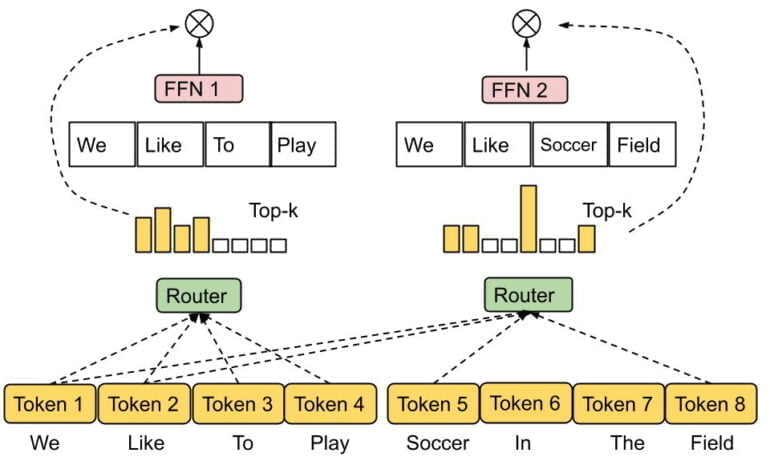 In dem mit GShard trainierten MoE-Transformer wird üblicherweise jedes Token von zwei Experten verarbeitet. Dahinter steht die Intuition, dass die Künstliche Intelligenz nicht erfolgreich lernen kann, wenn es einen Experten nicht mit mindestens einem weiteren Experten vergleichen kann.
