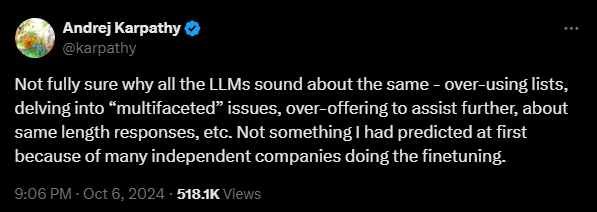 Zu den Beobachtungen der beiden Forscher passt auch die Feststellung des bekannten KI-Entwicklers Andrej Karpathy, Ex-OpenAI- und Tesla-KI-Chef: Alle LLMs klingen fast identisch. "Das hätte ich nicht erwartet, da viele unabhängige Firmen das Feintuning vornehmen", schreibt Karpathy.
