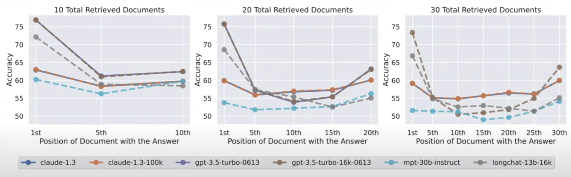 Befindet sich die relevante Information jedoch in der Mitte der Eingabe, sinkt die Leistung signifikant. Dieser Leistungsrückgang war besonders ausgeprägt, wenn das Modell eine Frage beantworten musste, für die es Informationen aus mehreren Dokumenten extrahierte - das Äquivalent zu einem Studenten, der relevante Informationen aus mehreren Kapiteln identifizieren muss, um eine Prüfungsfrage zu beantworten.