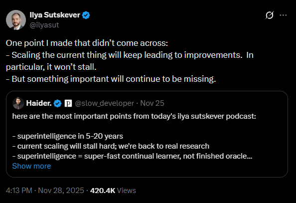 Auf X relativiert Sutskever seine Aussagen zum Ende der Skalierung. Er stellt klar, dass die aktuelle Skalierungstechnologie weiterhin zu Verbesserungen führen werde und dieser Fortschritt nicht zum Stillstand komme. Dennoch würde dabei „etwas Wichtiges“ fehlen.