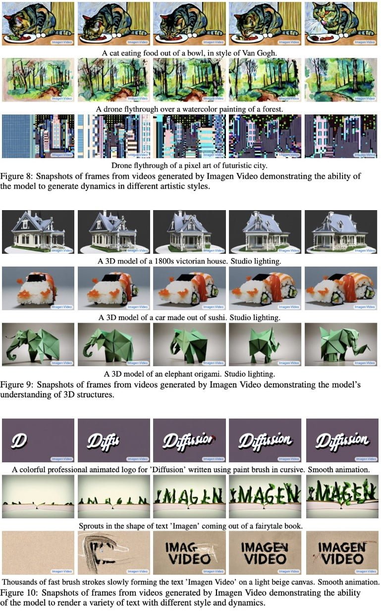 Imagen Video beherrscht wie generative Bildsysteme verschiedene künstlerische Stile - von Pixel Art bis Van Gogh - hat laut Google ein Verständnis für 3D-Objekte und kann Wörter korrekt buchstabieren. Eine Besonderheit, die schon der Imagen-Bild-KI vorbehalten war.