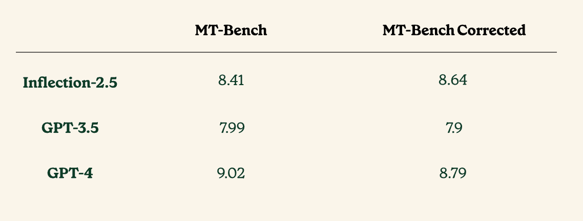 Im MT-Bench, der die Konversationsfähigkeit von KI-Modellen testet und wie gut diese einem Prompt folgen können, schneidet Inflection 2.5 zwischen GPT-3.5 und GPT-4 ab.