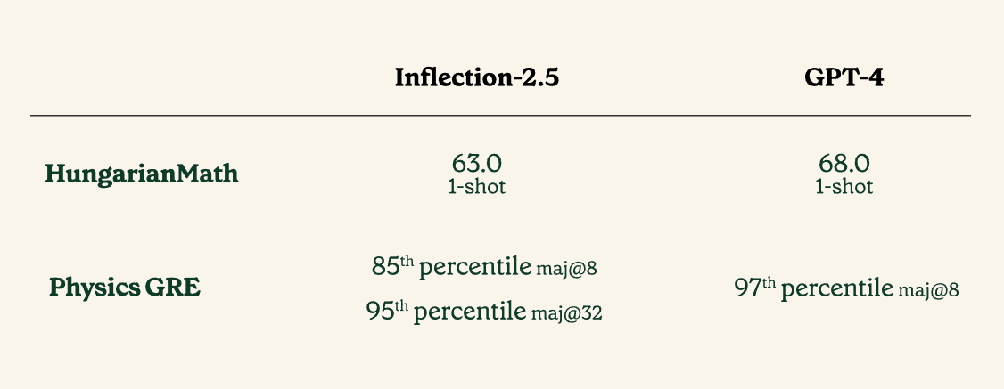 Das Modell wurde auch in der ungarischen Mathematikprüfung, die nicht in den Trainingsdaten enthalten sein sollte, und im Physik-GRE, einer Aufnahmeprüfung für das Physikstudium, getestet. Inflection-2.5 erreichte das 85. Perzentil der menschlichen Testpersonen im Physik-Test und kam mit einer erweiterten Prompting-Methode nahe an die maximale Punktzahl heran, knapp hinter GPT-4.