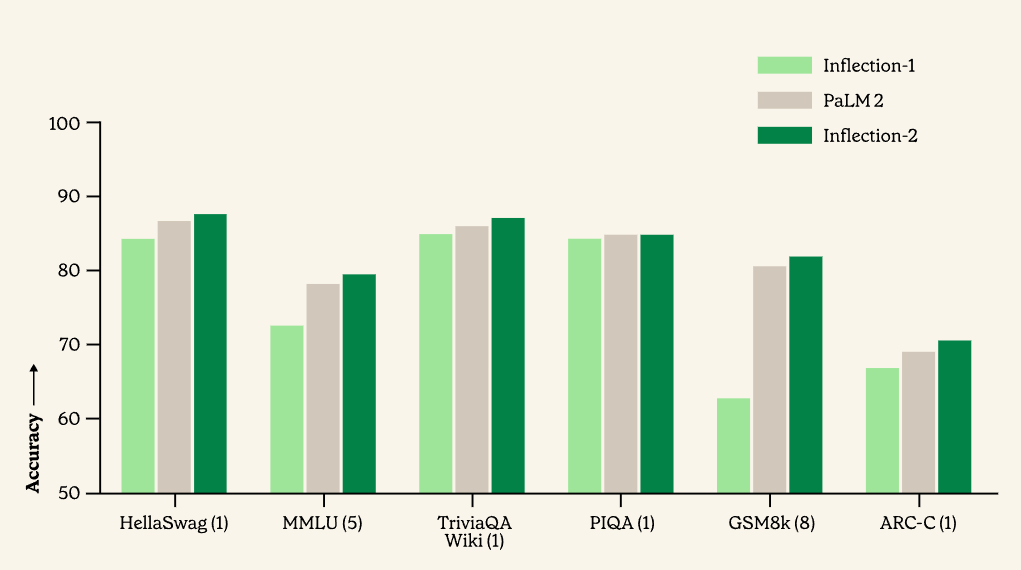 Inflection-2 übertrifft PaLM 2 Large jedoch in den meisten Standard-KI-Leistungstests, einschließlich des bekannten MMLU-Benchmarks, der eine breite Palette von Aufgaben vom Highschool- bis zum professionellen Niveau abdeckt, und anderer Sprachtests wie TriviaQA, HellaSwag und GSM8k.