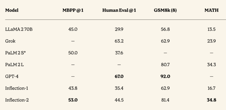 Inflection-1 wurde erst im Juli veröffentlicht. Das Modell lag etwa auf dem Niveau von GPT-3.5 und PaLM-540B. Inflection-2 soll jetzt zu GPT-4 aufschließen.