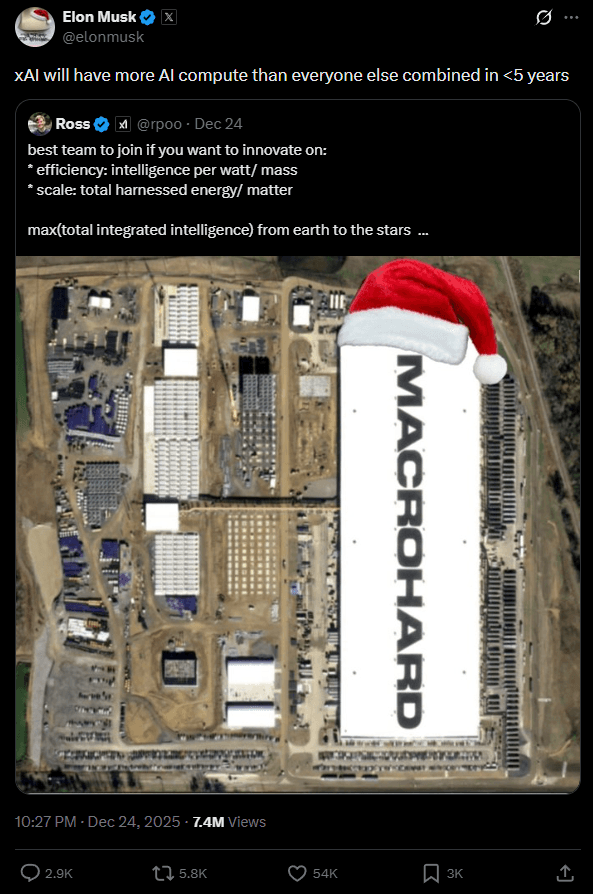 Das neue Rechenzentrum trägt den Namen "Macrohardrr" – eine Anspielung auf Microsoft. Der Name spiegelt Musks Ziel wider, mit xAI ein KI-Softwareunternehmen aufzubauen, das mit Microsoft konkurrieren kann. Anfang Dezember hatte Musk auf X bereits "MACROHARDER coming soon" geschrieben, als Reaktion auf ein Satellitenbild, das das Wort "Macrohard" auf dem Dach von Colossus 2 zeigte.