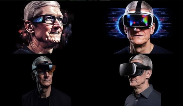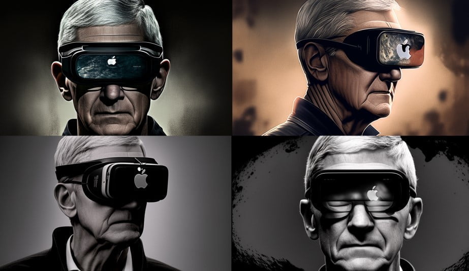 Auch Porträts bekannter Personen sehen realistischer aus und weisen weniger Bildfehler auf. Hier der Vergleich zwischen v4 und v5 zum Prompt: "Apple CEO Tim Cook wearing closed VR headset with non-transparent front and Apple logo on it, digital art".
