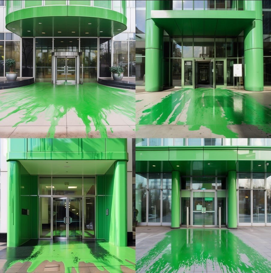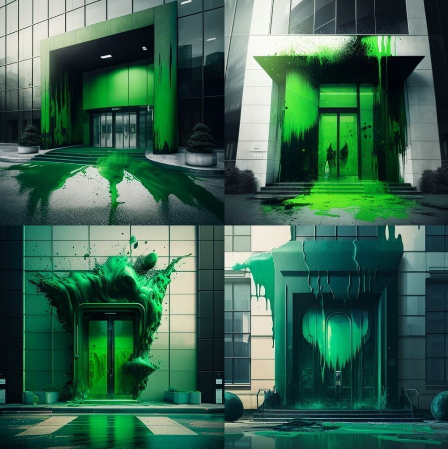 Der Prompt "The grand glazed entrance to a large corporate building, a large gush of green paint spilling out of the front door onto the street" führt in V4 zu einer zwar realistischen, aber dennoch stärker illustrativen Darstellung, während v5 ohne explizite Foto-Vorgabe bereits fotorealistische Bilder generiert.