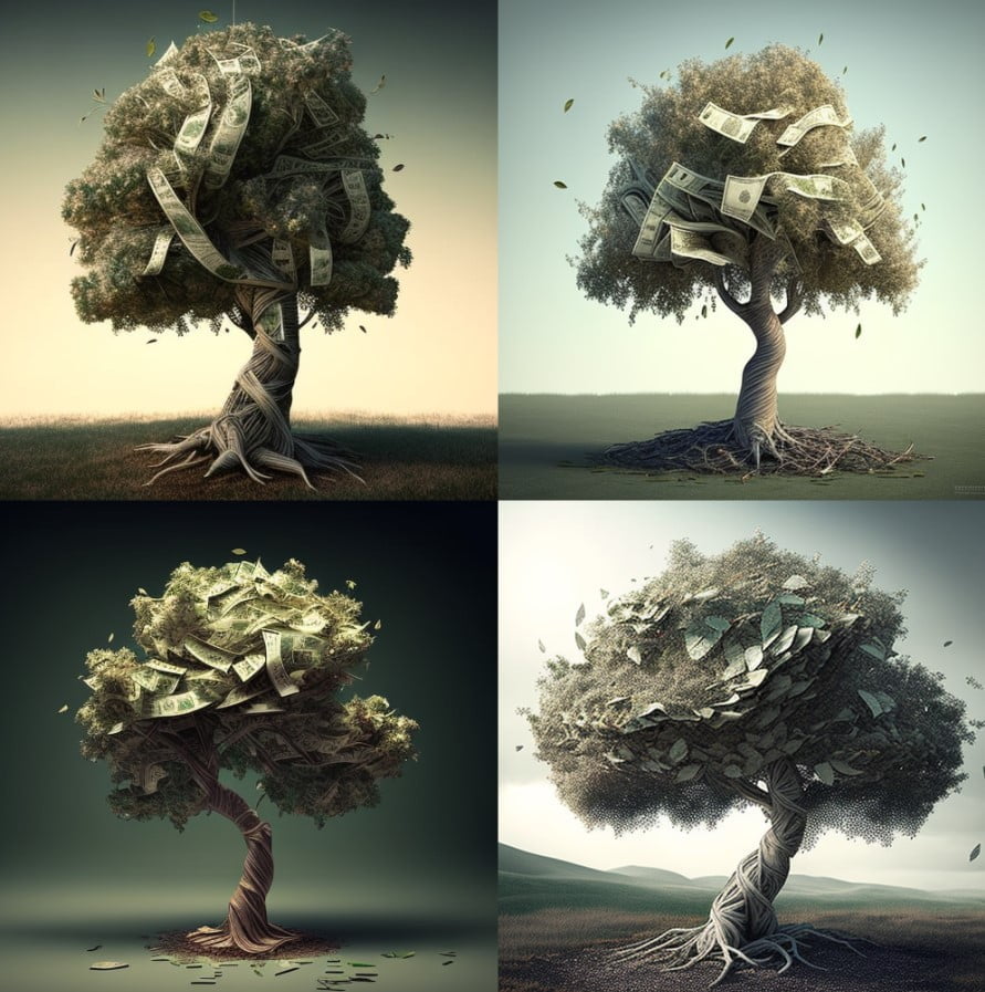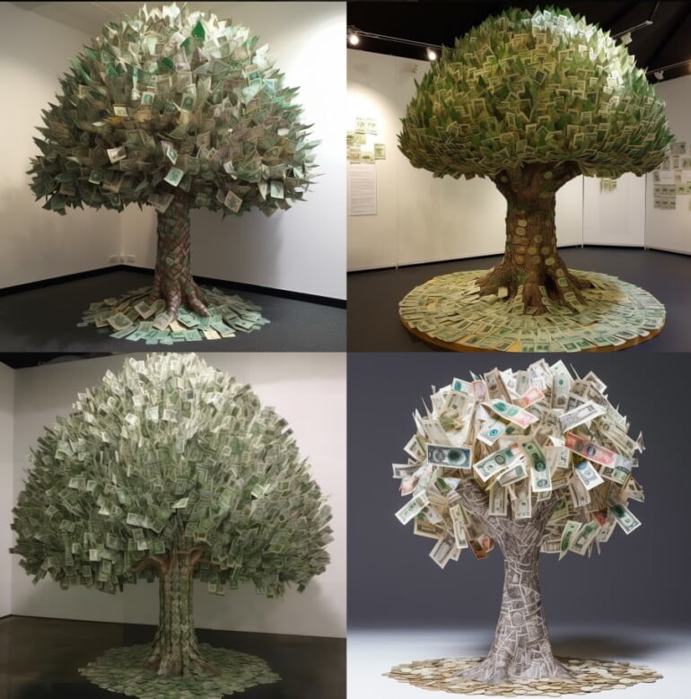 Dies zeigt auch der erste Test: Die gleichen Prompts ohne explizite Vorgabe eines Bildstils führten zu deutlich realistischeren Bildern mit mehr Details. Hier zum Beispiel der Prompt "a tree made of banknotes" im Vergleich, bei dem v4 eine Illustration erzeugt, während v5 eher eine fotorealistische Installation in einem Museum bevorzugt. Das Ergebnis von v5 gibt zudem den beabsichtigten Inhalt des Bildbefehls deutlich umfassender wieder.
