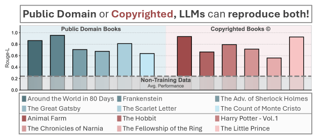 Das Ergebnis: Modelle können Inhalte aus allen Kategorien teilweise nahezu exakt wiedergeben, bei den neueren, nicht trainierten Büchern dagegen kaum. Das bestärkt die These, dass sich die Modelle an im Training gesehene Artikel erinnern.