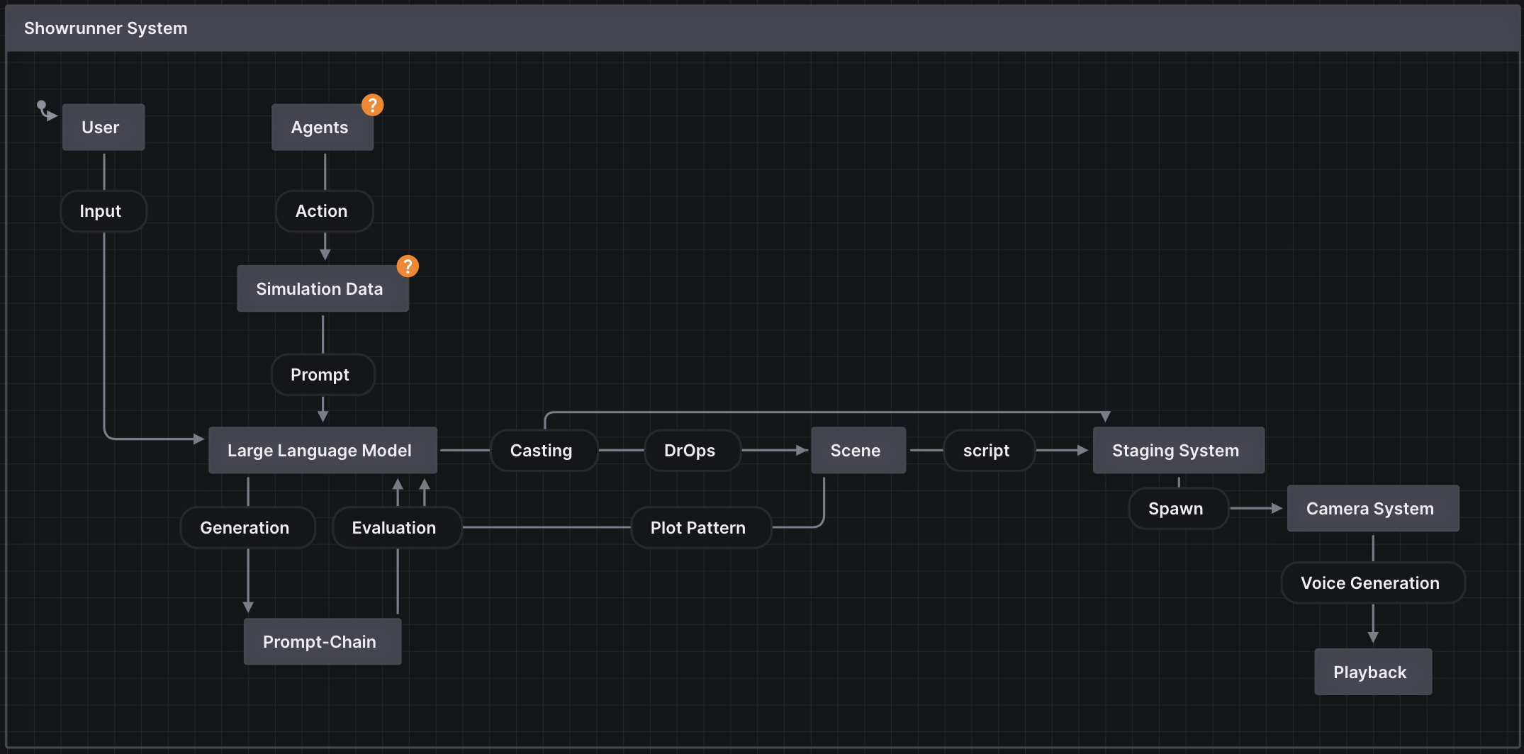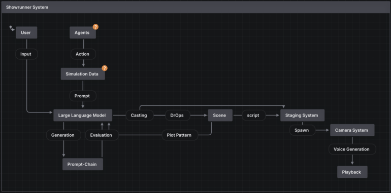 Die Simulation liefert in der Regel den grundlegenden IP-basierten Kontext, die Geschichte der Charaktere, Emotionen, Ereignisse und Orte, die den Ausgangspunkt für den kreativen Prozess bilden. Der Benutzer bringt seine Intentionalität ein, übt die Verhaltenskontrolle über die Agenten aus und liefert die anfänglichen Aufforderungen, die den generativen Prozess in Gang setzen.
