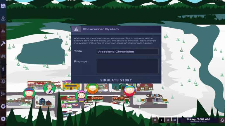 Die Erstellung einer kompletten South-Park-Folge ist ein komplexer Prozess. Das Storytelling-System wird mit einer Idee auf abstrakter Ebene gestartet, normalerweise in Form eines Titels, einer Zusammenfassung und wichtiger Ereignisse, die innerhalb einer simulierten Woche (etwa drei Stunden Spielzeit) stattfinden sollen. Die Generierung einer einzelnen Szene kann eine "signifikante Zeit" in Anspruch nehmen und bis zu einer Minute dauern.