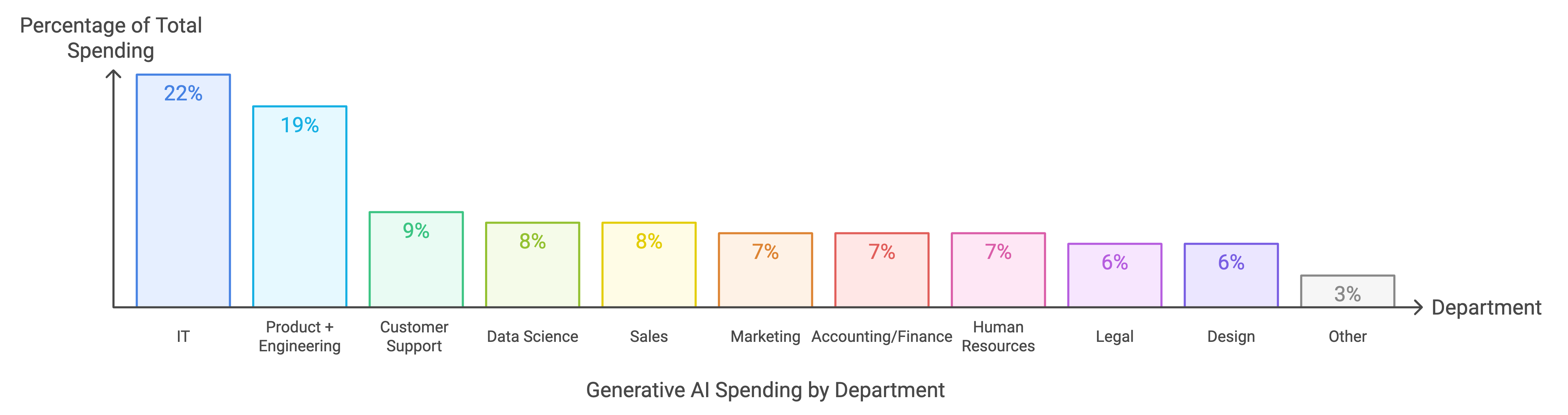 Die Umfrage zeigt auch, welche Abteilungen am meisten in KI investieren: IT-Abteilungen führen mit 22 Prozent, gefolgt von Produkt und Engineering (19 Prozent) sowie Data Science (8 Prozent). Aber auch kundennahe Bereiche wie Support (9 Prozent), Vertrieb (8 Prozent) und Marketing (7 Prozent) setzen verstärkt auf KI-Lösungen. Hier ist aber bemerkenswert: Bis auf die Rechtsabteilung mit 3 Prozent fächert sich die Adoption von generativer KI auf alle Unternehmensbereiche auf (was sagt das über Jurist:innen?).