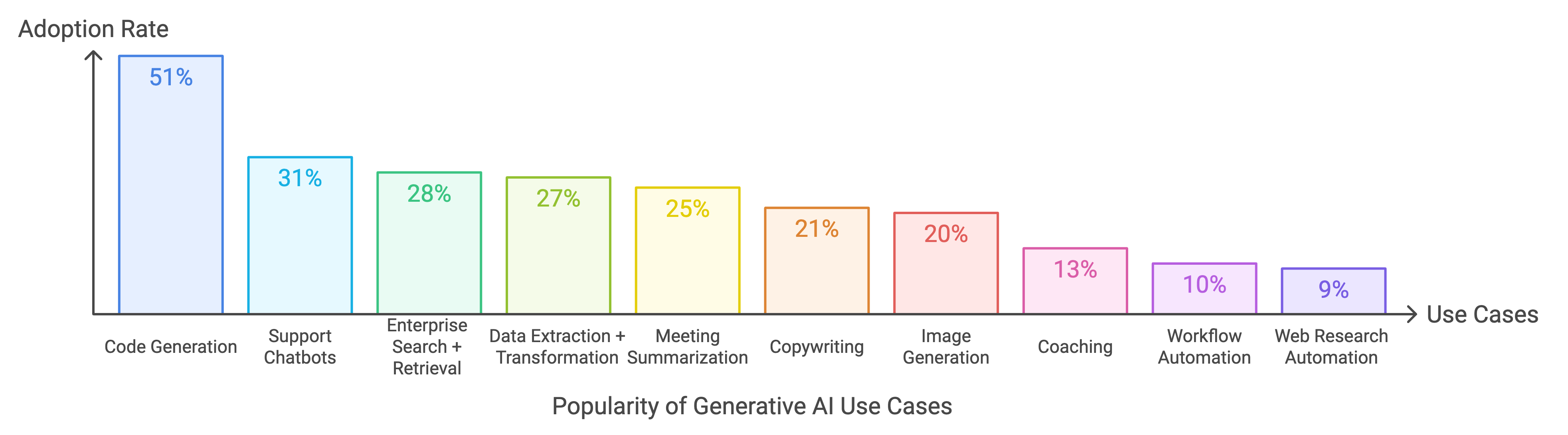 Bei den konkreten Anwendungsfällen dominieren derzeit Code-Copiloten mit einer Adoptionsrate von 51 Prozent. Support-Chatbots folgen mit 31 Prozent, Enterprise-Suche und Datenextraktion liegen bei etwa 28 Prozent. Automatische Meeting-Zusammenfassungen werden von 24 Prozent der Unternehmen genutzt.