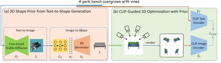 Eine Text-Eingabe wird bei Dream3D zuerst an ein feinjustiertes Stable-Diffusion-Modell weitergeleitet, um ein Bild im Rendering-Stil zu synthetisieren. Dieses Bild wird dann von einem weiteren Modell in eine 3D-Form umgewandelt.