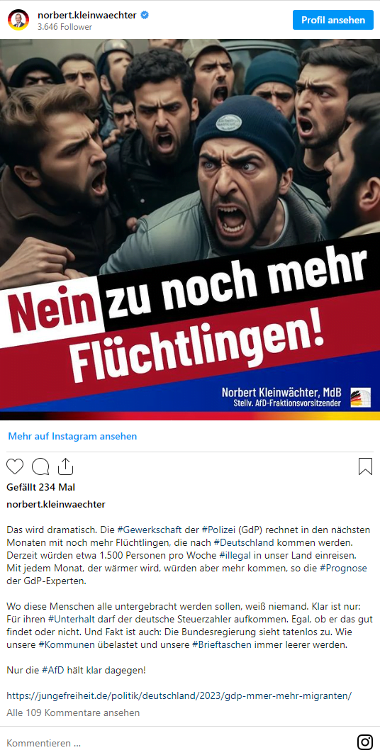 Im März 2023 machte der stellvertretende AfD-Fraktionsvorsitzende Norbert Kleinwächter mit einem KI-Bild auf sich aufmerksam. "Nein zu noch mehr Flüchtlingen", heißt es plakativ in seinem Instagram-Post, auf dem wütende Menschen mit aufgerissenen Mündern zu sehen sind. Es war nicht das letzte KI-Bild auf Kleinwächters Kanal, auch politische Gegner karikiert er gerne mit Midjourney.