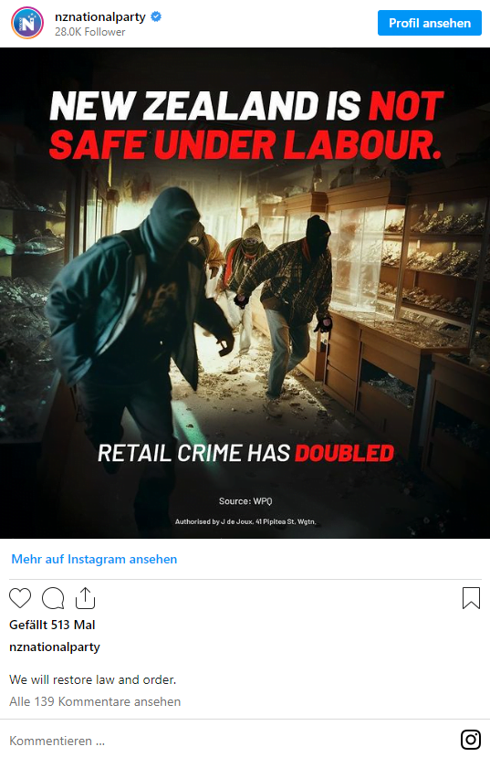 Einen realistischeren Eindruck vermittelt das Bild, das die konservativ-rechtsliberale New Zealand National Party auf Instagram verwendet. "New Zealand is not safe under labour", ist auf ein Bild mit gesichtslosen Einbrechern:innen montiert. Einen Hinweis auf die Herkunft des Bildes gibt es nicht. Wähler:innen reagieren in den Kommentaren unterschiedlich: Während einige die "Trump-artige" Politik verurteilen, begrüßen andere den Einsatz moderner Technologien.