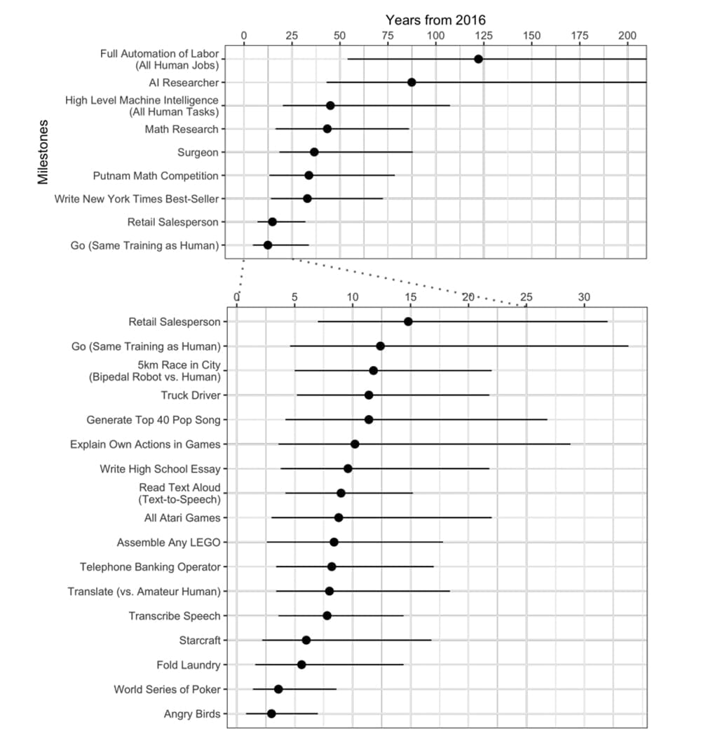 Experteneinschätzungen zufolge wird Künstliche Intelligenz den Menschen in den nächsten zehn Jahren bei vielen Tätigkeiten übertreffen. Menschliche Übersetzer sollen beispielsweise schon ab circa 2024 überflüssig sein. NLP-KIs sollen ab 2026 Aufsätze für die gymnasiale Oberstufe und einen Bestseller ab 2049 schreiben können.