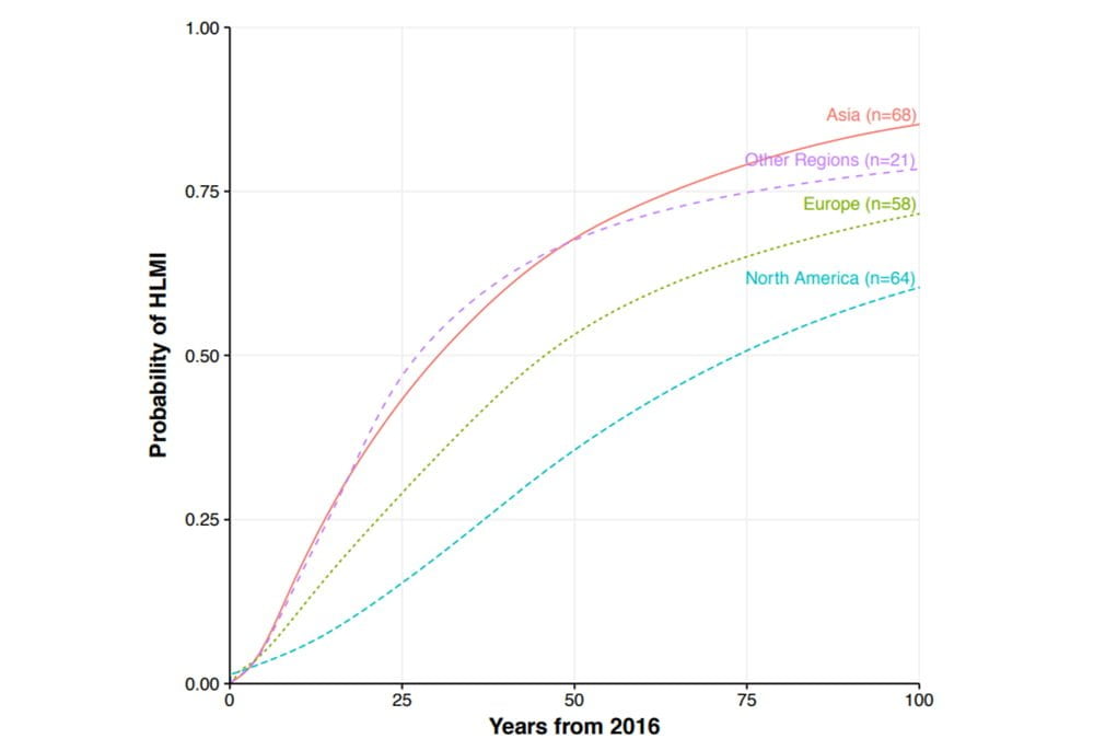 Die Forscher sehen eine 50-prozentige Wahrscheinlichkeit, dass KI den Menschen schon in 45 Jahren bei allen Aufgaben übertreffen wird. Dies würde zu einer Automatisierung aller menschlichen Jobs in 120 Jahren führen. Forscher aus Asien erwarten diese Veränderung im Schnitt 44 Jahre früher als nordamerikanische Forscher.
