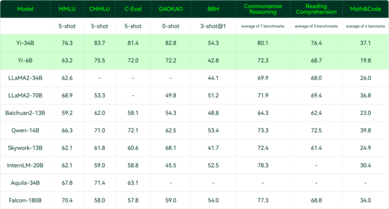 Das Unternehmen veröffentlicht Benchmark-Ergebnisse, bei denen Yi-34B auf oder sogar deutlich über dem Niveau von Metas Llama2-70B und Falcon-180B liegt, die mehr als doppelt oder fünfmal so viele Parameter haben. Das kleinere Modell Yi-6B liegt auf dem Niveau von Llama2-34B.