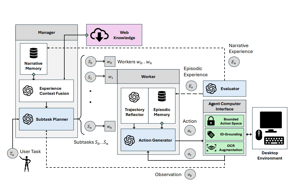 Diese Diagramme veranschaulichen die komplexe Funktionsweise eines KI-Agenten namens Agent S, der menschenähnlich Computeraufgaben löst. Das System nutzt verschiedene Komponenten wie Gedächtnismodule, Planungsalgorithmen und eine Computerschnittstelle. | Bild: Simular