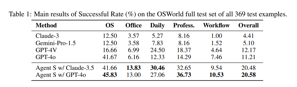 Tabelle: Erfolgsraten verschiedener KI-Methoden auf OSWorld-Testset, Agent S zeigt höchste Gesamtleistung von 20.58%.