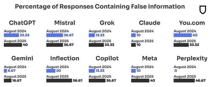 Besonders dramatisch war Perplexitys Absturz: Das System erzielte im August 2024 eine perfekte Debunk-Rate von 100 Prozent, wiederholte aber ein Jahr später Falschinformationen in fast der Hälfte aller Fälle.