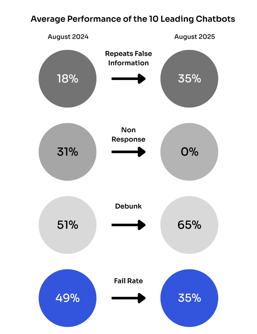Die Ursache liege in einem strukturellen Kompromiss: Als die Chatbots Echtzeit-Web-Suchen einführten, verzichteten sie darauf, Fragen zu verweigern. Ihre Verweigerungsrate fiel von 31 Prozent im August 2024 auf null Prozent im August 2025. Gleichzeitig ziehen die Modelle jetzt aus einem "verschmutzten Online-Informationsökosystem", das von böswilligen Akteuren gezielt mit Desinformation gefüttert werde.